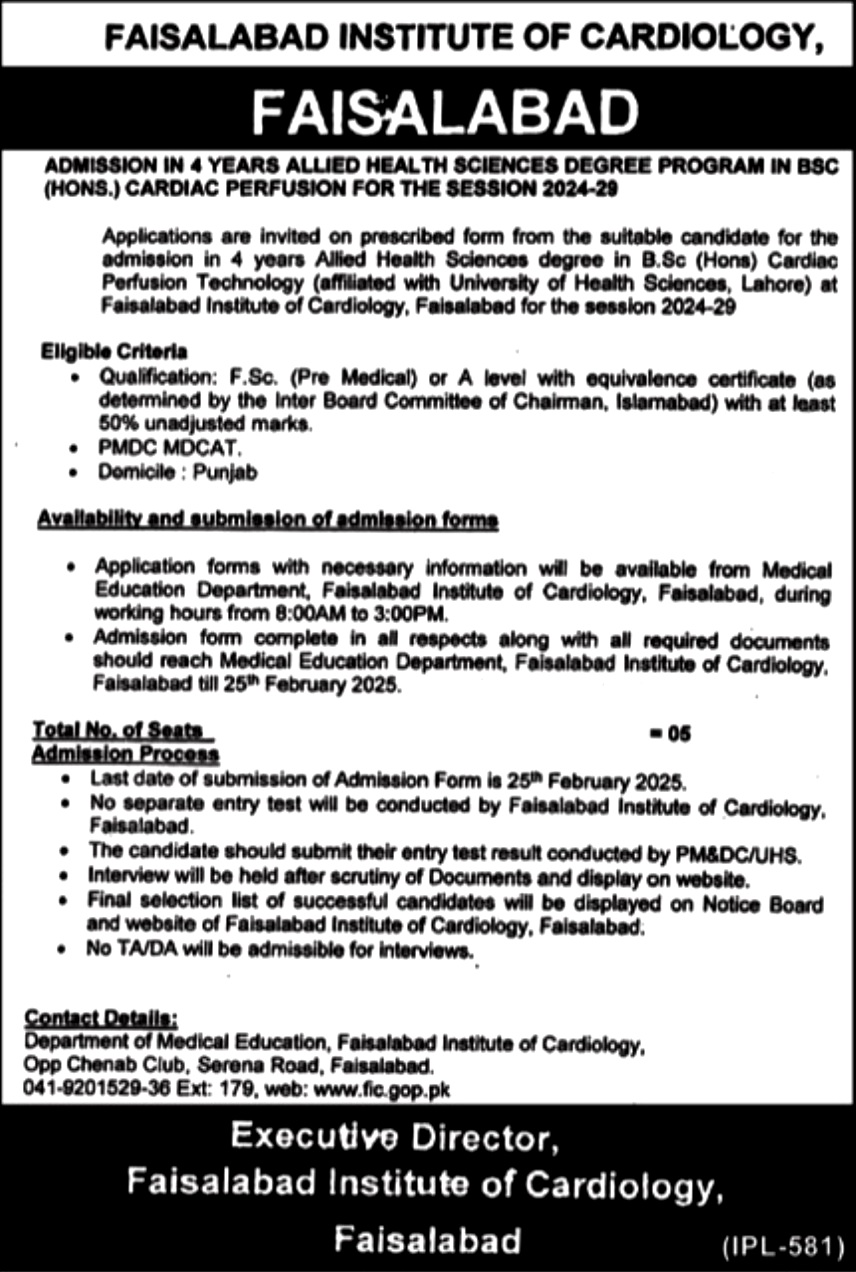 Faisalabad Institute of Cardiology (FIC), Faisalabad BSc (Hons) Cardiac Perfusion Technology Program Admissions Session 2024-25