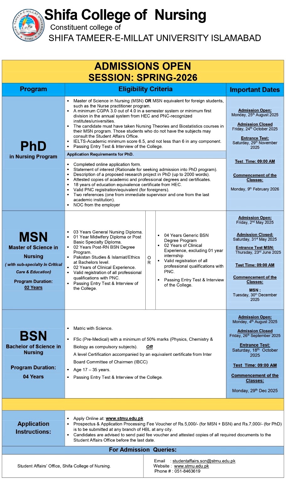 Shifa College of Nursing, Islamabad PhD Nursing Admission Spring 2026