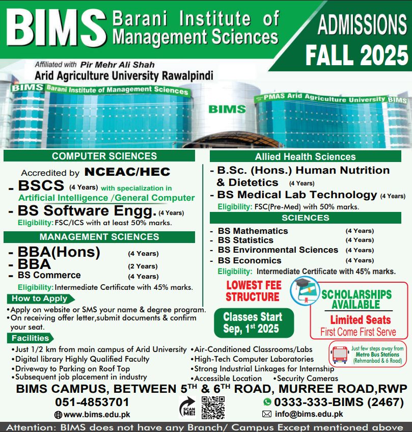 Barani Institute of Management Sciences (BIMS), Rawalpindi Admissions Fall 2025