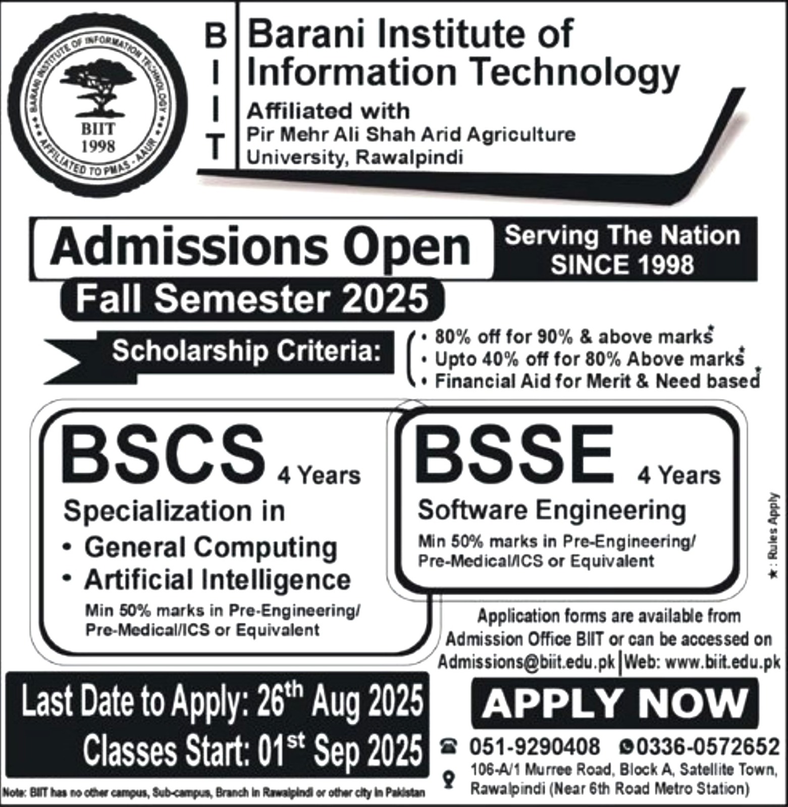 Barani Institute of Information Technology (BIIT), Rawalpindi BS Programs Admissions Fall 2025