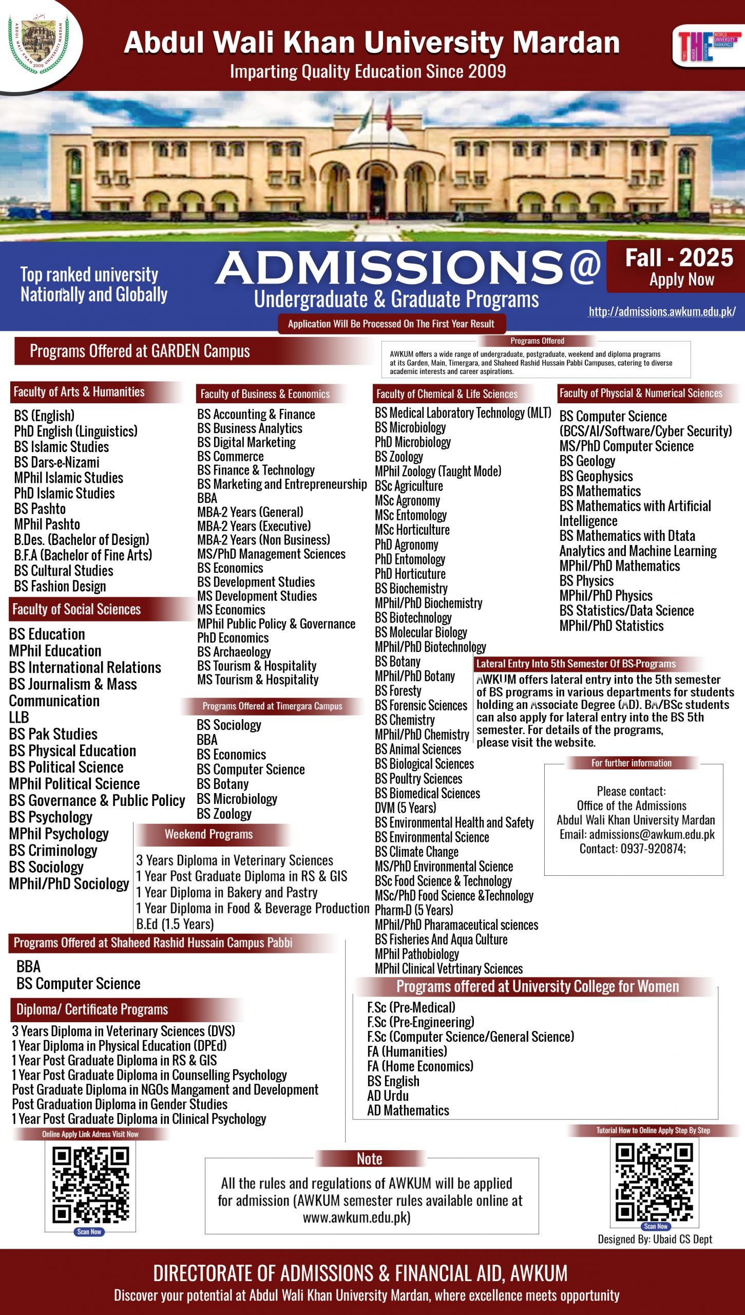Abdul Wali Khan University, Shaheed Rashid Hussain Campus, Pabbi Nowshera Undergraduate Admissions Fall 2025