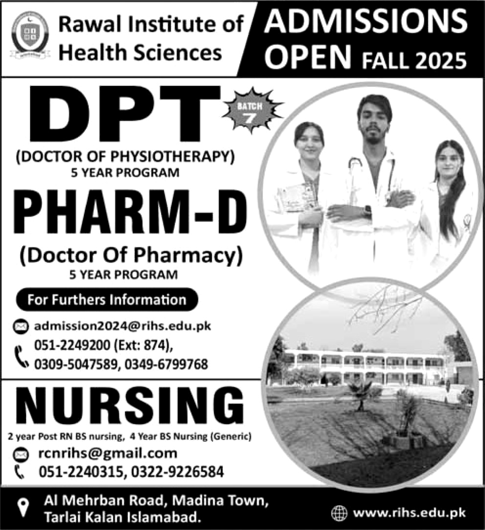 Rawal Institute of Health Sciences, Islamabad Pharm-D, DPT & BS Nursing Admissions Session 2025-26
