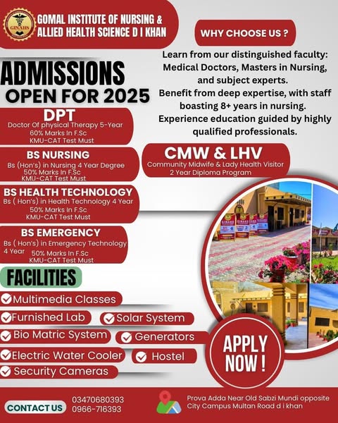 Gomal Institute of Nursing & Allied Health Sciences (GINAHS), Dera Ismail Khan Admissions 2025-26