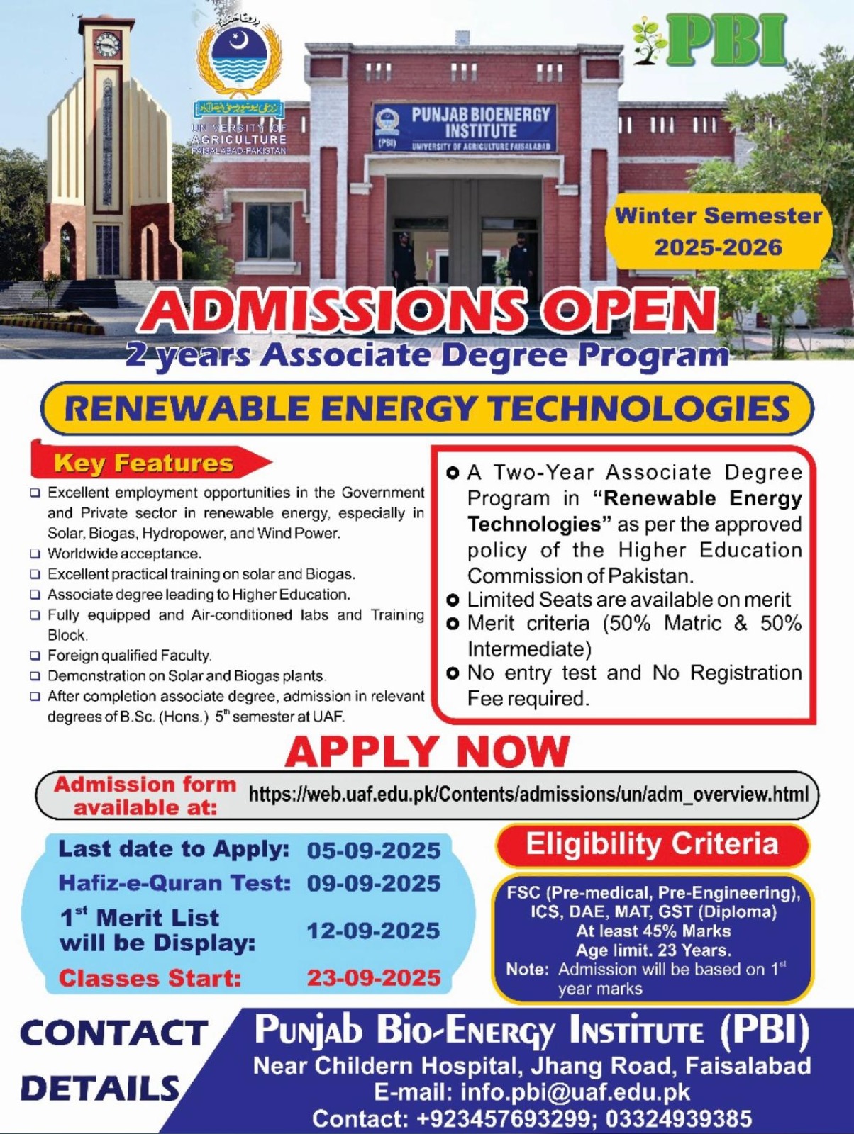 University of Agriculture, Faisalabad (UAF) Associate Degree Programs (ADP) in Renewable Energy Technologies Admissions Winter 2025-26