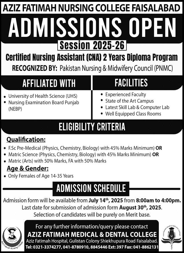 Aziz Fatimah Nursing College, Faisalabad Certified Nursing Assistant (CNA) Admissions Session 2025-26