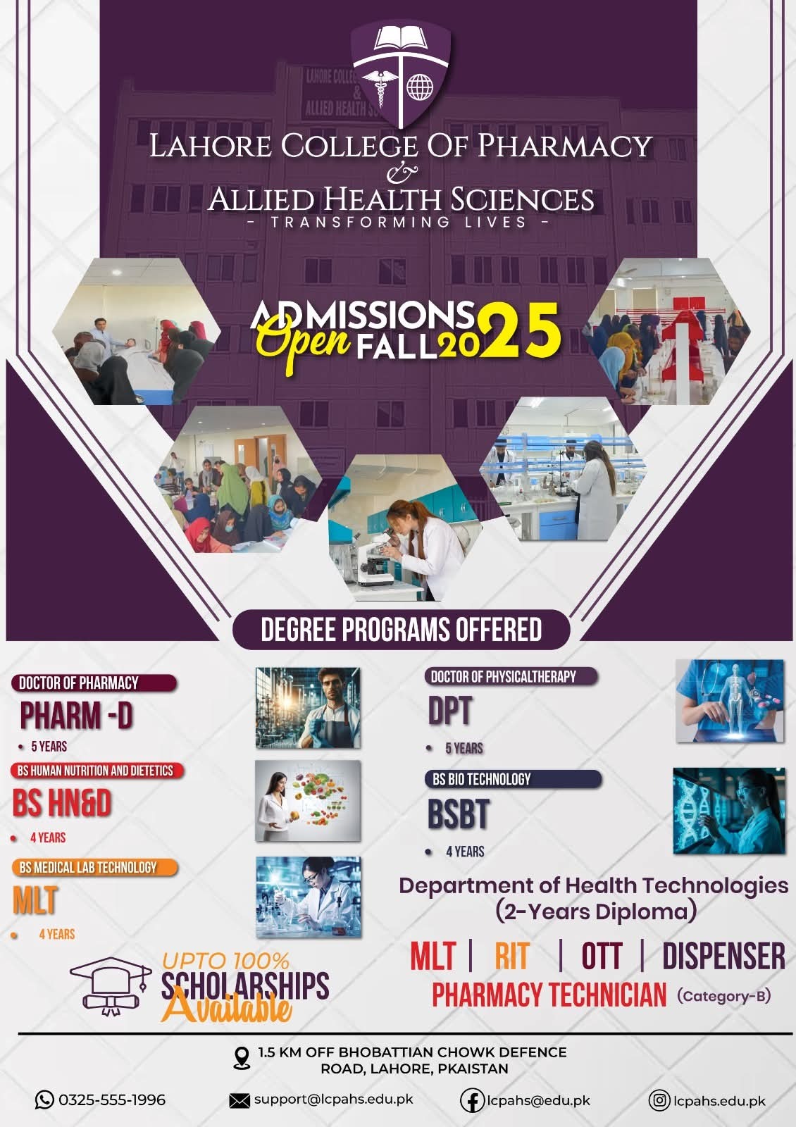 Lahore College of Pharmacy & Allied Health Sciences, Lahore Admissions Fall 2025