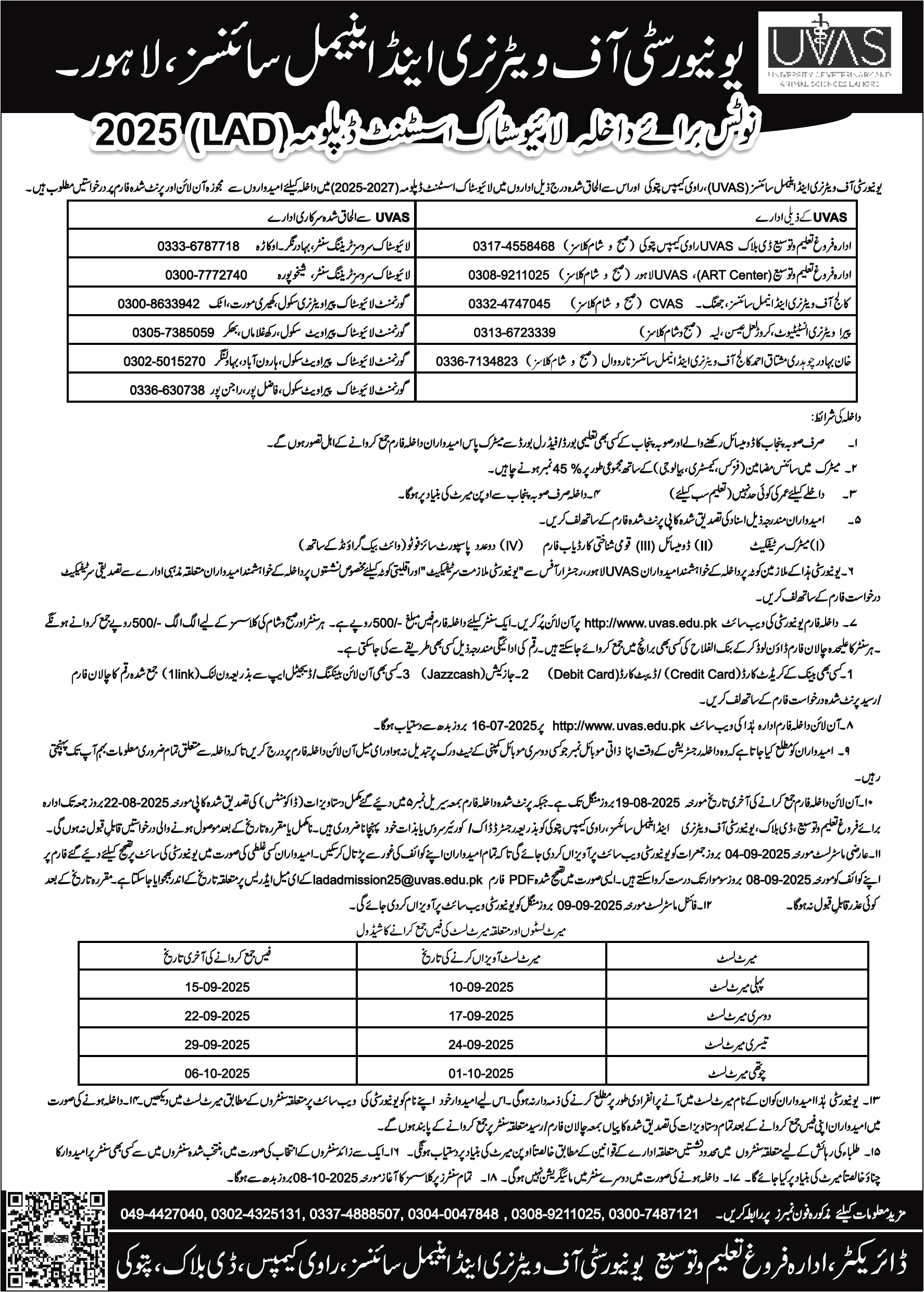 University of Veterinary & Animal Sciences (UVAS), Ravi Campus Pattoki Livestock Assistant Diploma (LAD) Admissions Session 2025