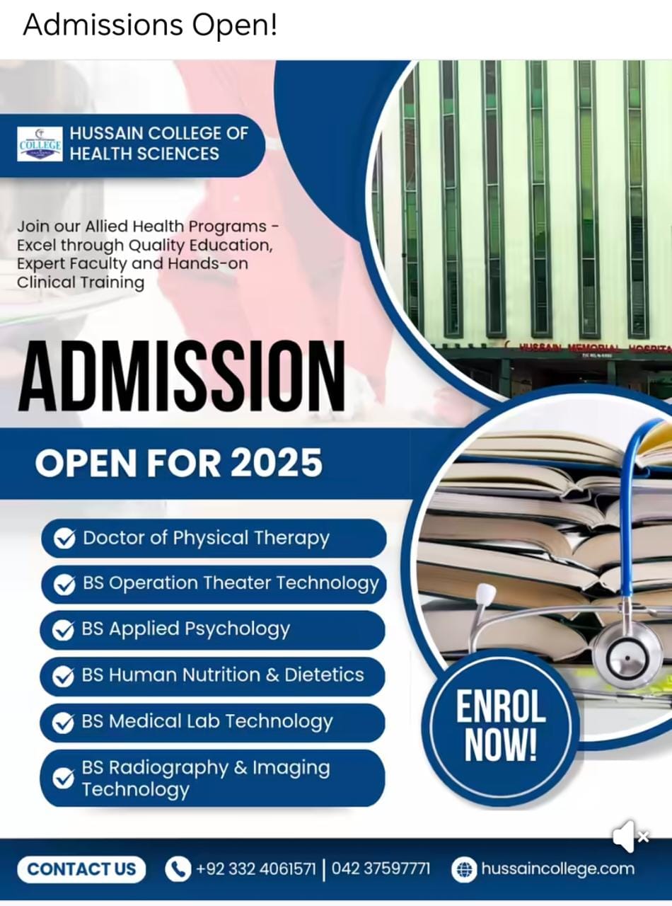 Hussain College of Health Sciences, Lahore Admissions Fall 2025