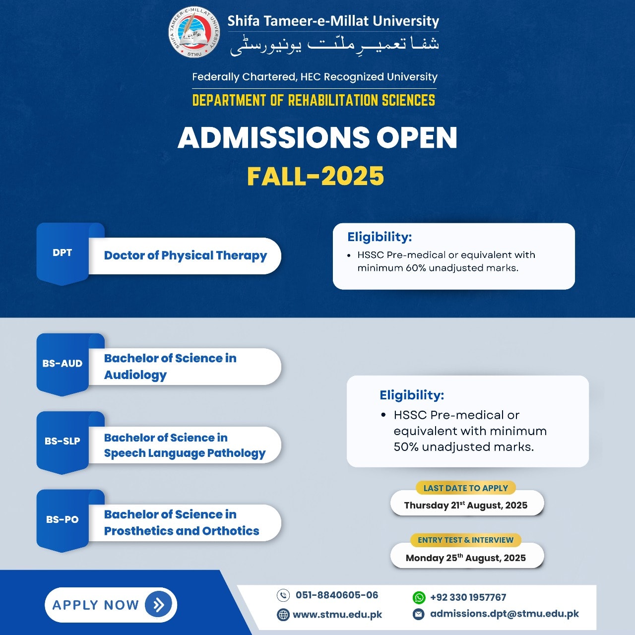 Shifa Tameer-e-Millat University (STMU), Islamabad BS Programs Admissions Fall 2025