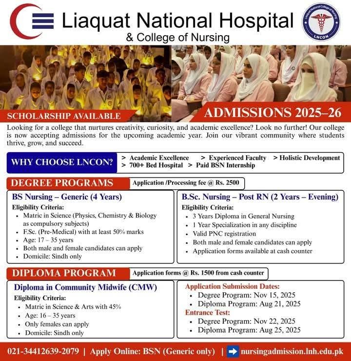 Liaquat National Hospital & College of Nursing, Karachi BS Nursing Admissions 2025-26