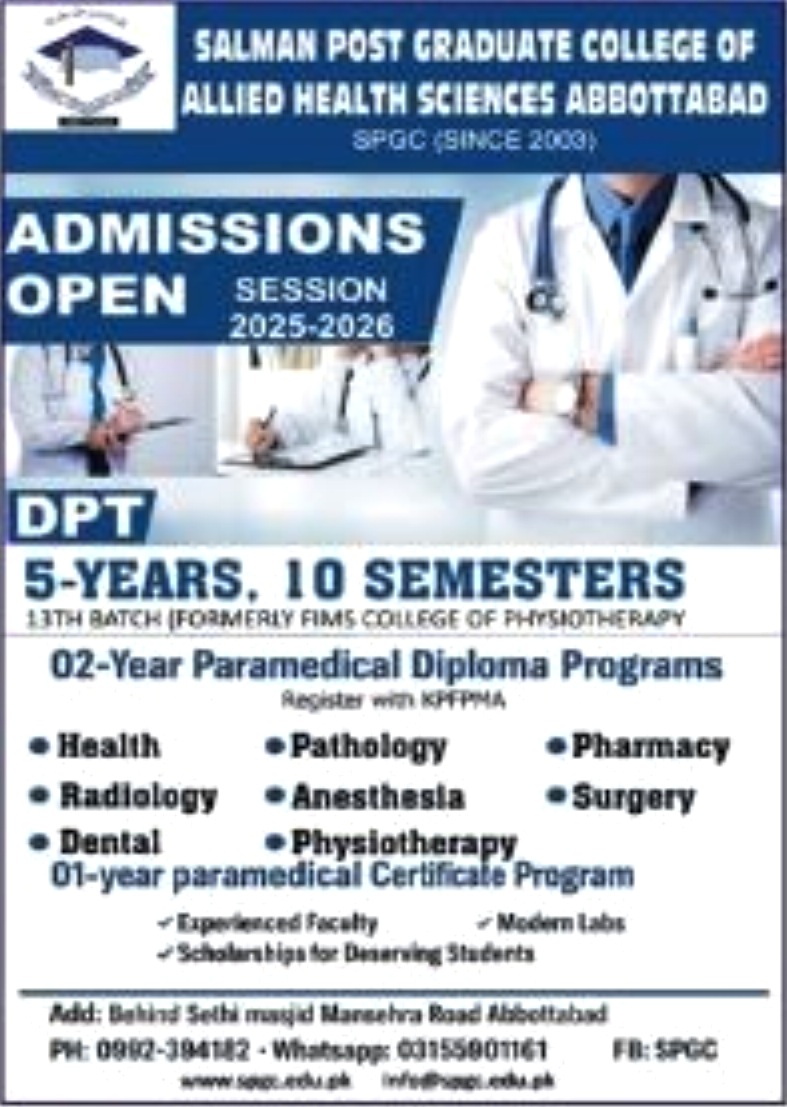 Salman Postgraduate College of Allied Health Sciences, Abbottabad DPT & Diploma Programs Admissions Session 2025-26