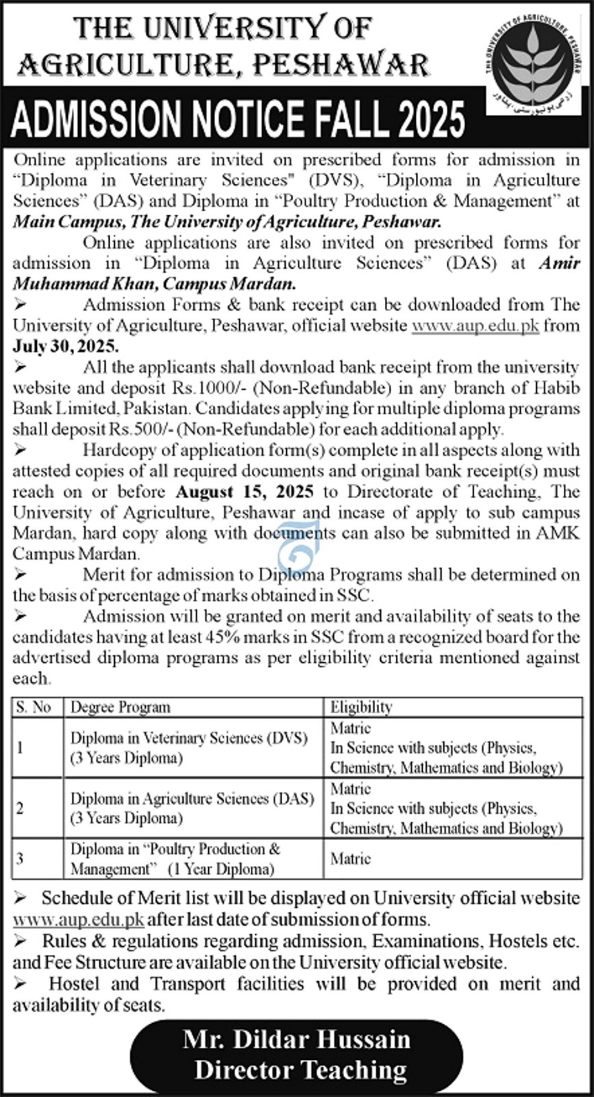 The University of Agriculture, Amir Muhammad Khan Campus Mardan Diploma in Agricultural Sciences (DAS) Admissions Fall 2025