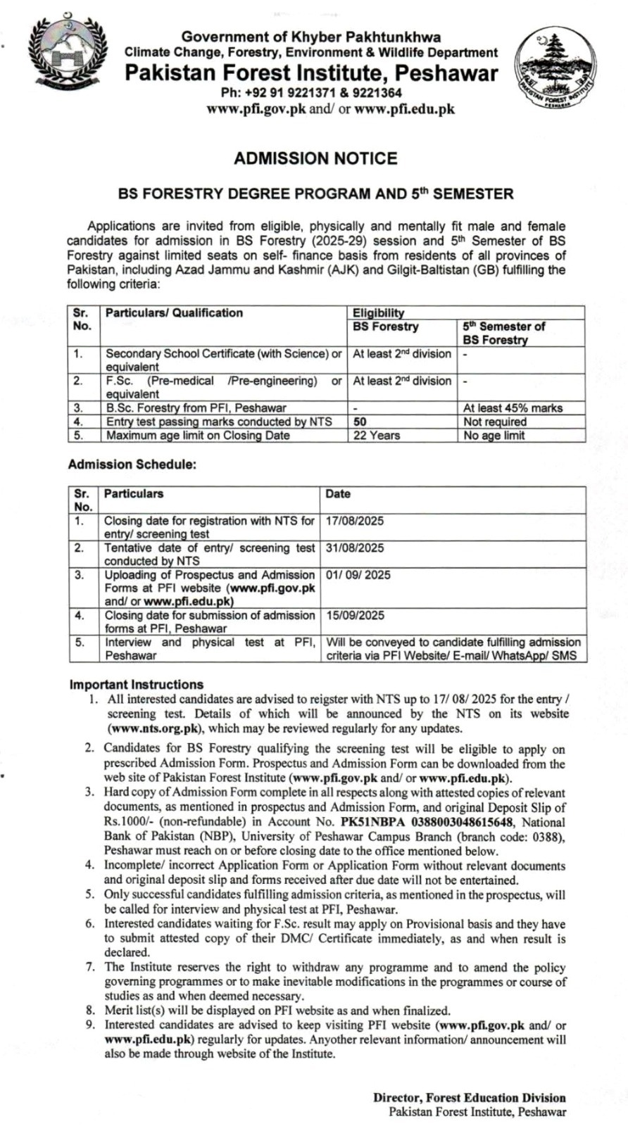 Pakistan Forest Institute (PFI), Peshawar BS Forestry & 5th Semester Admissions Session 2025