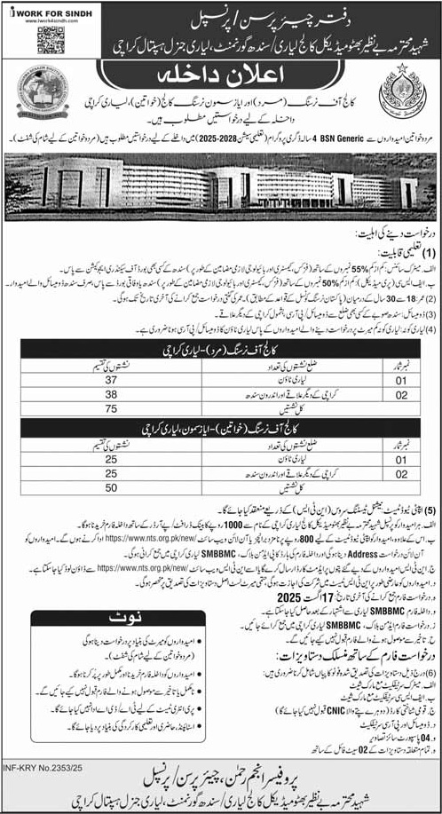 Shaheed Mohtarma Benazir Bhutto Medical College (SMBBMC), Lyari BS Nursing Admissions Session 2025-28