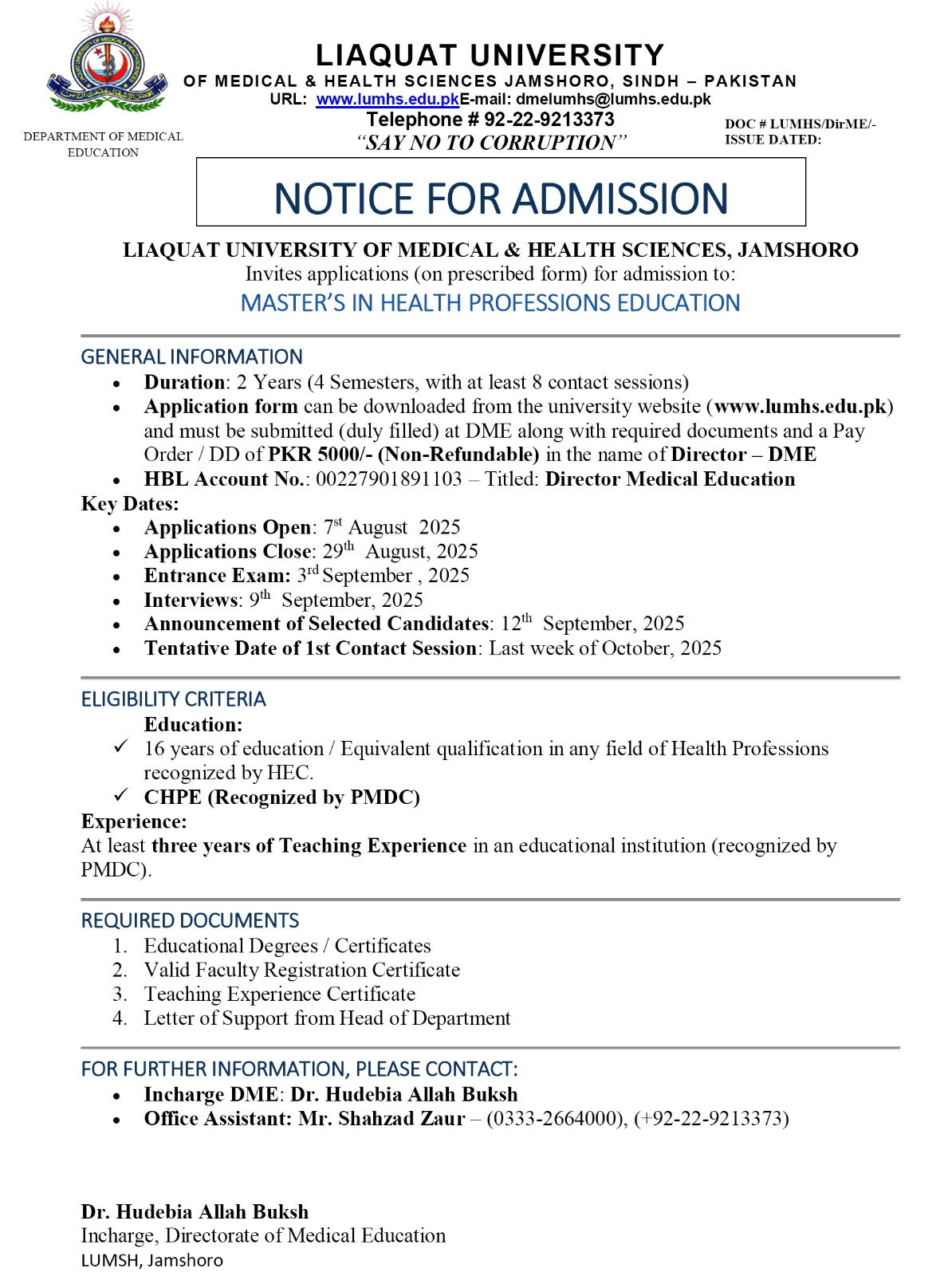 Liaquat University of Medical & Health Sciences (LUMHS), Jamshoro Master in Health Professions Education (MHPE) Admissions 2025