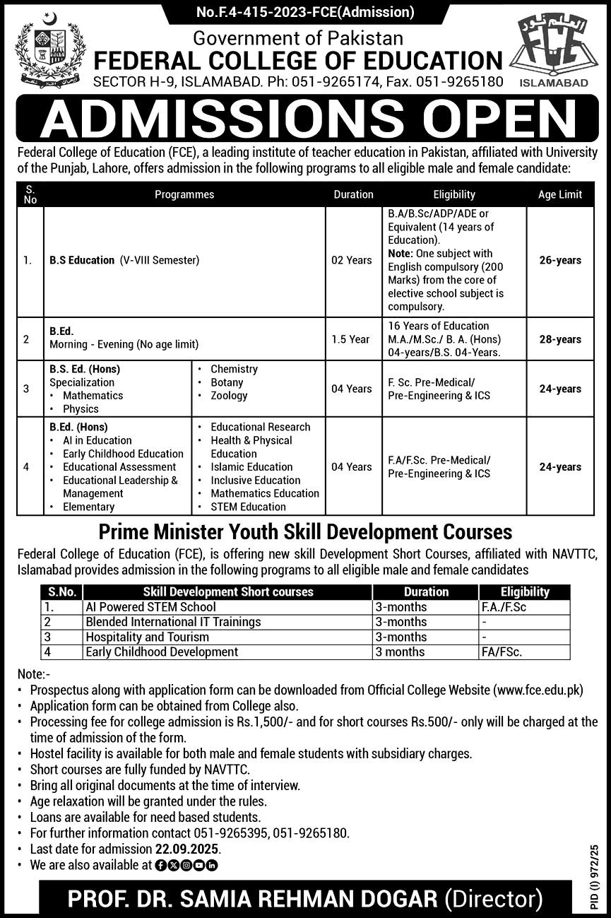 Federal College of Education (FCE), Islamabad Undergraduate Programs & Skill Development Courses Admissions 2025