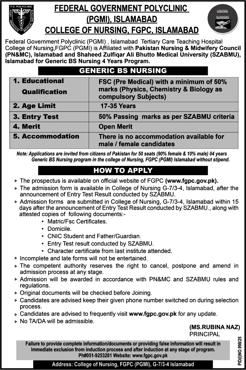 Federal Government Polyclinic (PGMI), Islamabad BS Nursing Admissions 2025