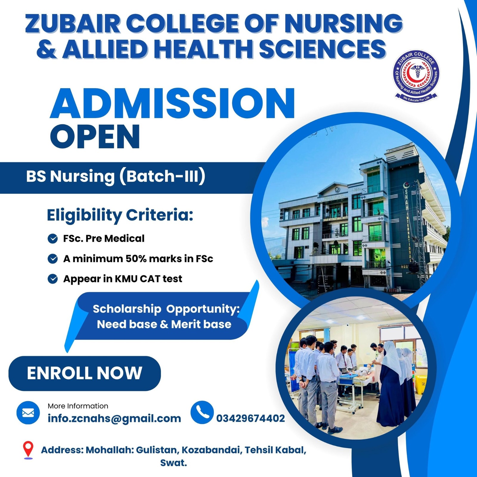 Zubair College of Nursing & Allied Health Sciences, Tehsil Kabal, Swat BS Nursing (Batch-III) Admissions Fall 2025