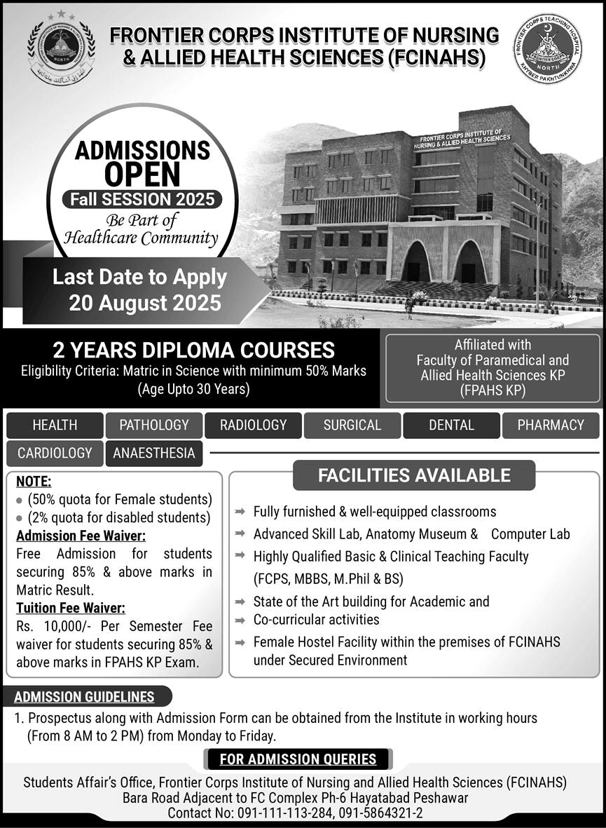 Frontier Corps Institute of Nursing & Allied Health Sciences (FCINAHS), Peshawar 02 Years Diploma Programs Admissions Fall 2025