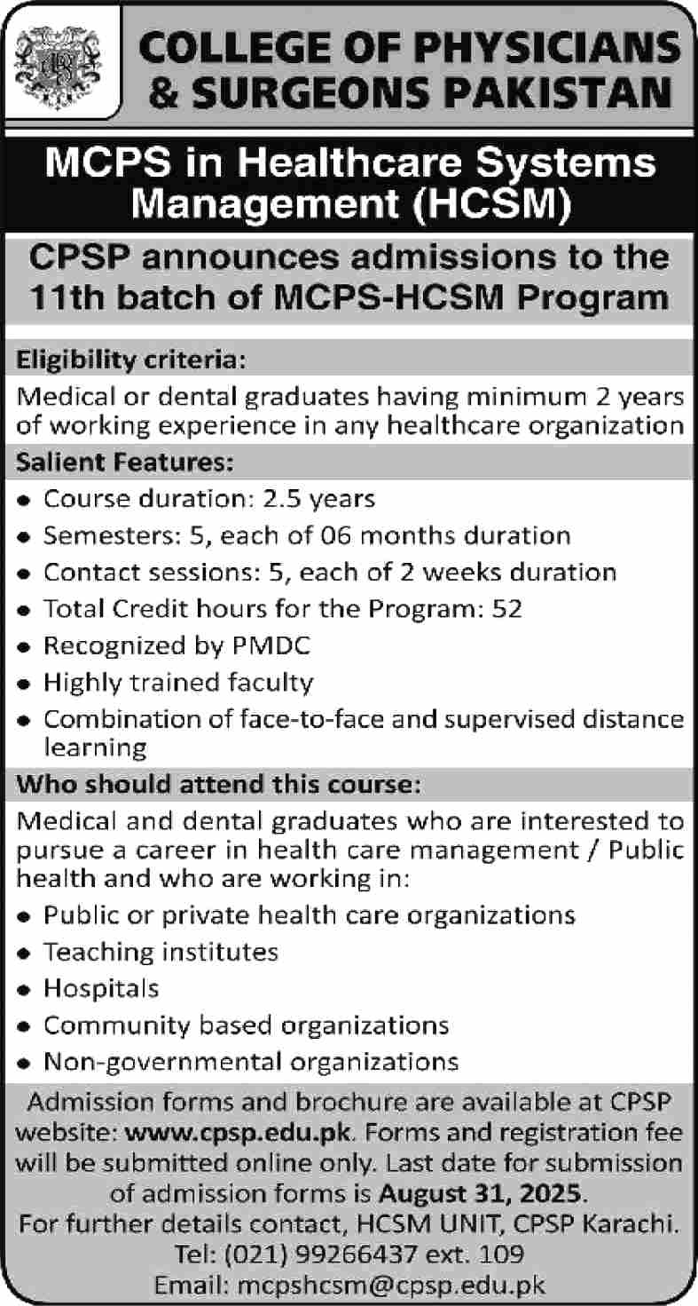 College of Physicians & Surgeons Pakistan (CPSP), Karachi MCPS in Health Care Systems Management (HCSM) Admissions 2025