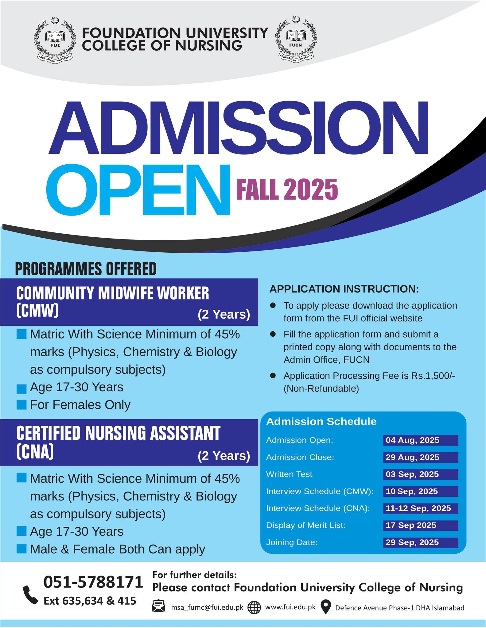 Foundation University College of Nursing, Islamabad CMW & CNA Diploma Programs Admissions Fall 2025