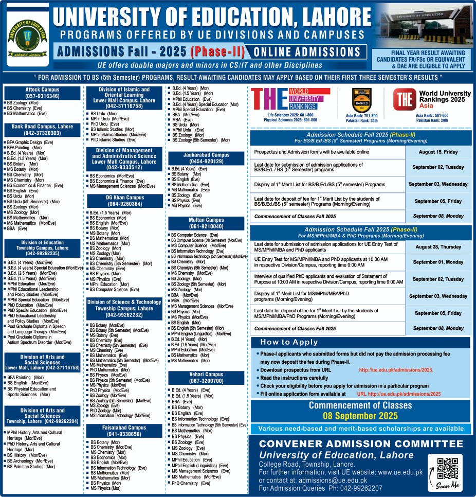 University of Education, Multan Campus Admissions Fall 2025 (Phase-II)