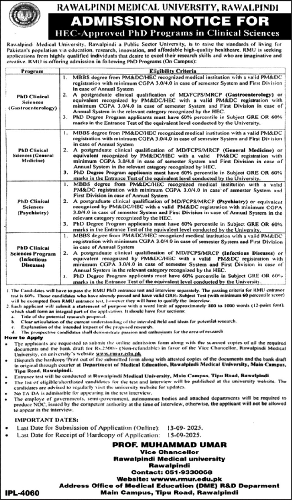 Rawalpindi Medical University (RMU), Rawalpindi PhD Programs Admissions 2025