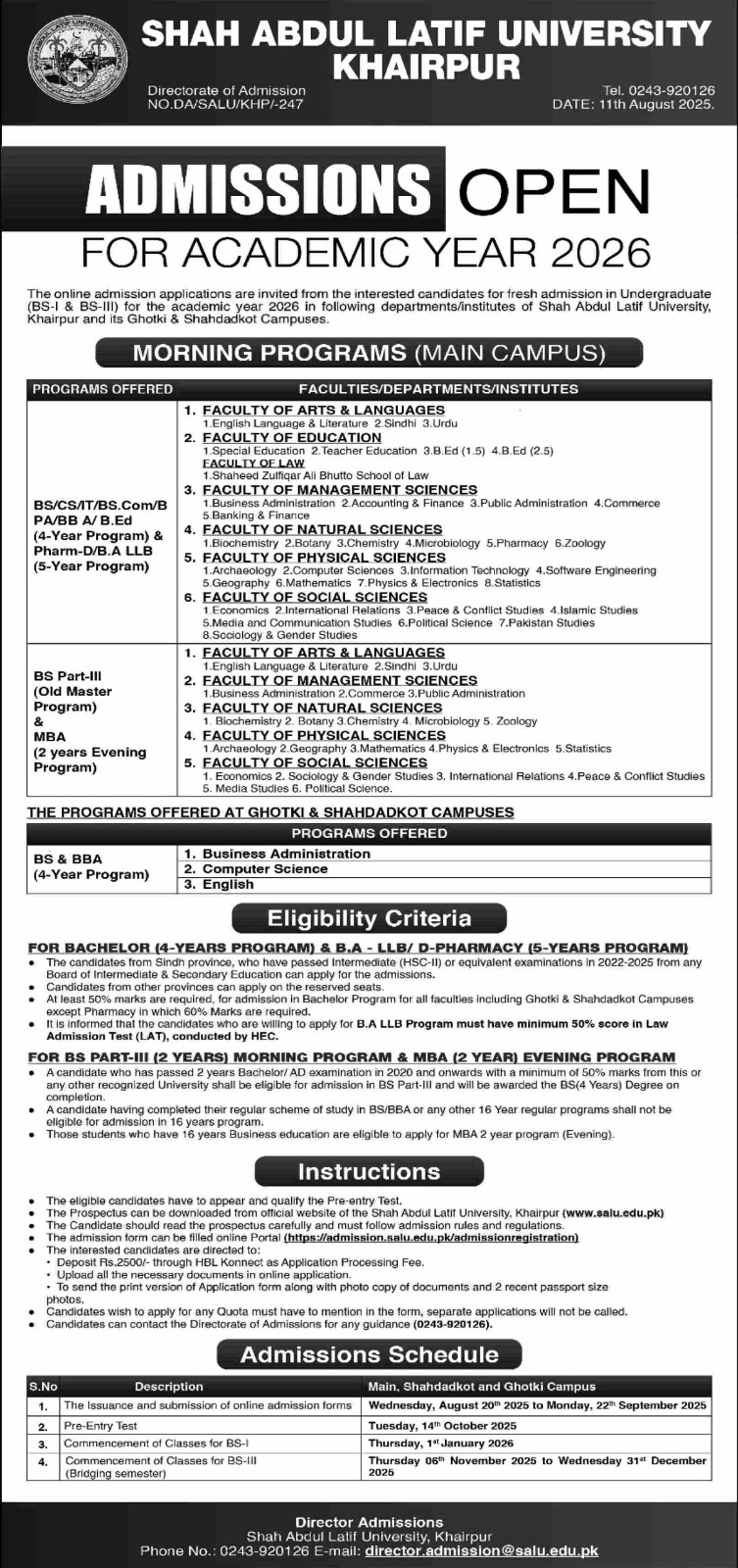 Shah Abdul Latif University (SALU), Ghotki Campus Admissions Session 2026